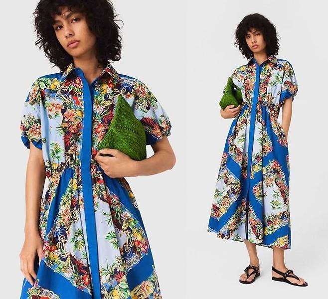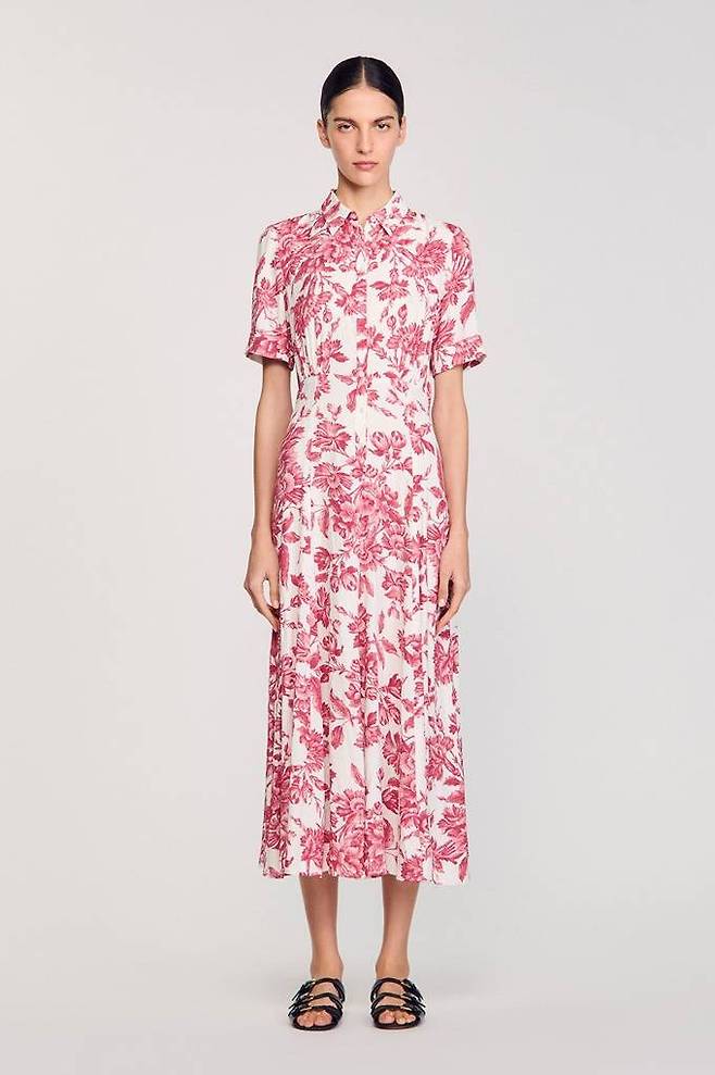 프렌치 컨템포러리 브랜드 '산드로(SANDRO)의 플라워 원피스는 셔츠형 디자인으로 선명하고 화려한 색감이 눈에 뛰며 일상 속에서도 여행을 떠난 듯 우하고 드레시한 감성을 연출한다.