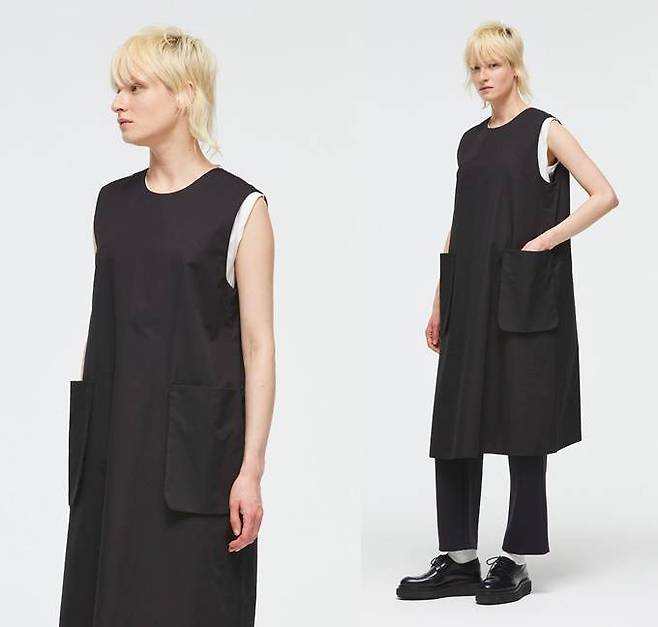 일본 디자이너 브랜드 '미즈이로 인드(mizuiro ind)' 원피스는 원피스는 입체적인 포켓 디테일과 군더더기 없는 미니멀한 디자인으로 A라인 실루엣의 원피스로 세련되고 여유로운 분위기를 연출한다.