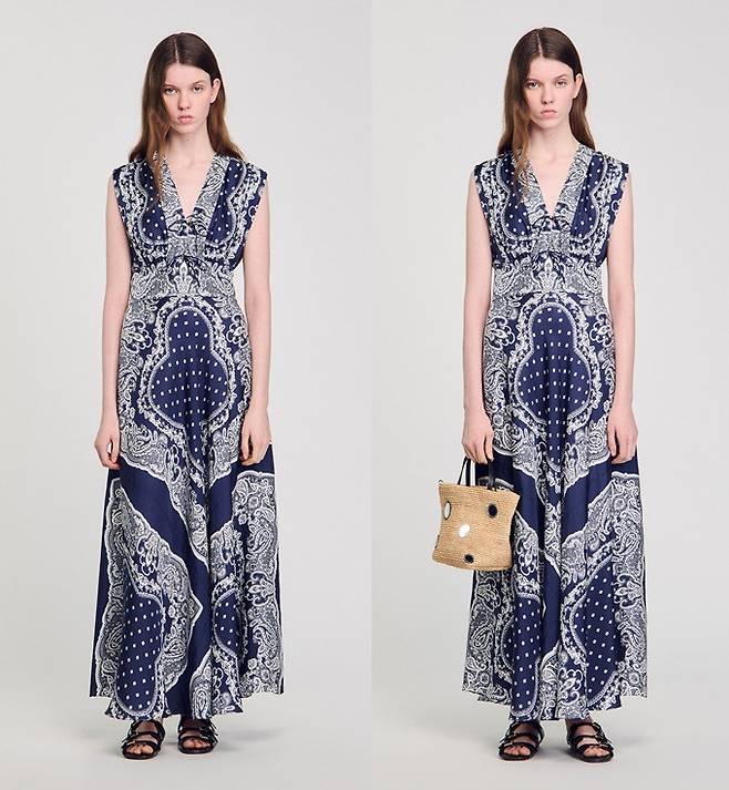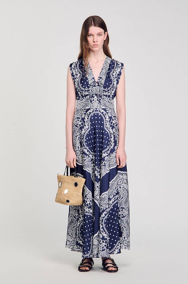프렌치 컨템포러리 브랜드 '산드로(SANDRO)의 반다나 패턴 맥시 원피스는 넥 라인의 리본 타이 디테일과 다채로운 반다나 프린트가 조화를 이루며 이국적인 멋을 선사한다.