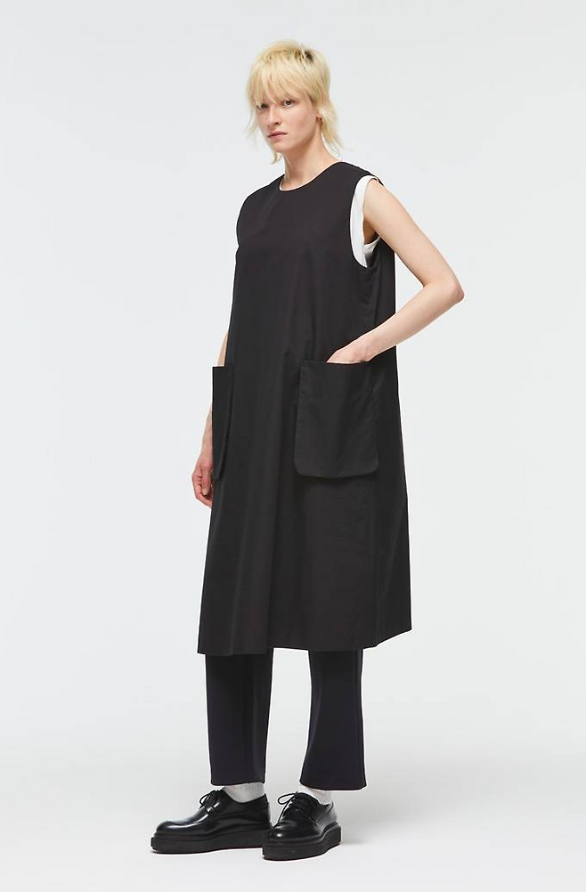 일본 디자이너 브랜드 '미즈이로 인드(mizuiro ind)' 원피스는 원피스는 입체적인 포켓 디테일과 군더더기 없는 미니멀한 디자인으로 A라인 실루엣의 원피스로 세련되고 여유로운 분위기를 연출한다.