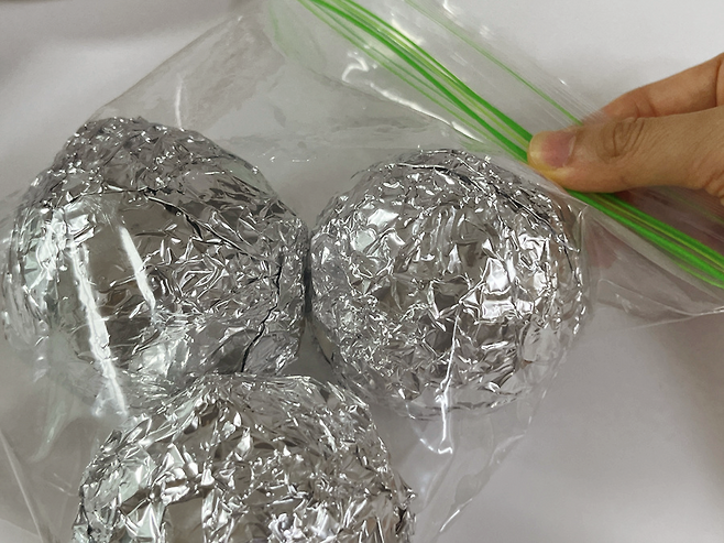 포일에 감싼 양파는 지퍼백에 넣어 보관합니다. 이렇게 양파를 보관하면 1~2주 지나도 잘 무르지가 않더라고요. 그리고 껍질을 까서 보관했기 때문에 요리할 때도 훨씬 편합니다.