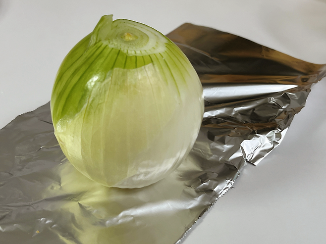 양파는 껍질을 깨끗하게 벗긴 후 포일로 꽁꽁 감싸줍니다.