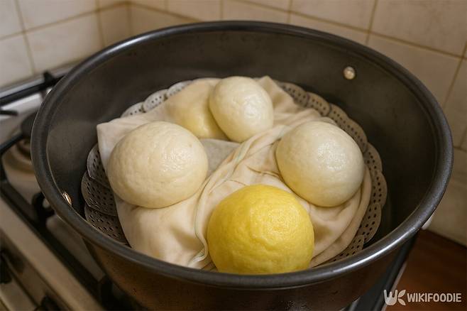 눈으로 호빵과 찐빵을 나누는 가장 쉬운 기준은 바닥에 붙은 종이다. 시장에서 파는 옛날 방식 찐빵은 찜기 바닥에 젖은 천을 깔고 그 위에 반죽을 올려 쪄낸다. 그래서 빵 바닥에 아무것도 붙어 있지 않고, 떼어냈을 때 표면이 거칠거나 축축한 느낌이 든다.