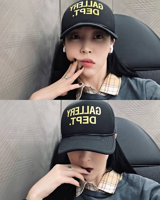 문별이 공개한 셀카가 단숨에 시선을 사로잡는다. 'GALLERY DEPT.' 문구가 돋보이는 블랙 볼캡을 깊게 눌러쓴 채 카메라를 응시하는 문별의 모습은 시크하면서도 힙한 분위기를 자아낸다. 배경의 톤온톤 텍스처와도 자연스럽게 어우러지며, 전체 착장의 무드를 한층 끌어올렸다.