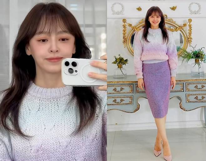 강성연은 그라데이션 컬러가 돋보이는 니트 스웨터와 퍼플 펜슬 스커트를 매치해 따뜻하면서도 여성스러운 룩을 연출했습니다.