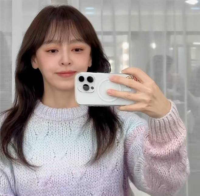 스웨터의 부드러운 색감은 밝고 사랑스러운 분위기를 배가시켰고, 퍼플 톤의 스커트는 클래식하면서도 우아한 느낌을 더해 눈길을 끌었습니다.