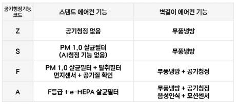 Z와 S등급은 벽걸이 에어컨에 공기청정 기능이 없고,