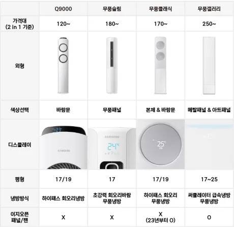 먼저 Q9000이 가장 저렴한 라인입니다.무풍기능이 없으며, 120만원부터 시작합니다.