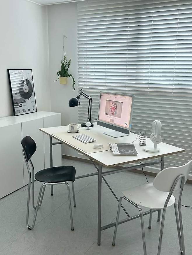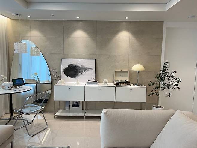 그리고 티비는 없지만 아트월 앞을 빈 공간으로 둘 수는 없어서 모듈 수납장을 놓았구요, 그 위에 액자랑 스탠드 턴테이블을 올려두었어요. 티비가 없어서 카페 같은 집에 한발 더 다가선 것 같아요.