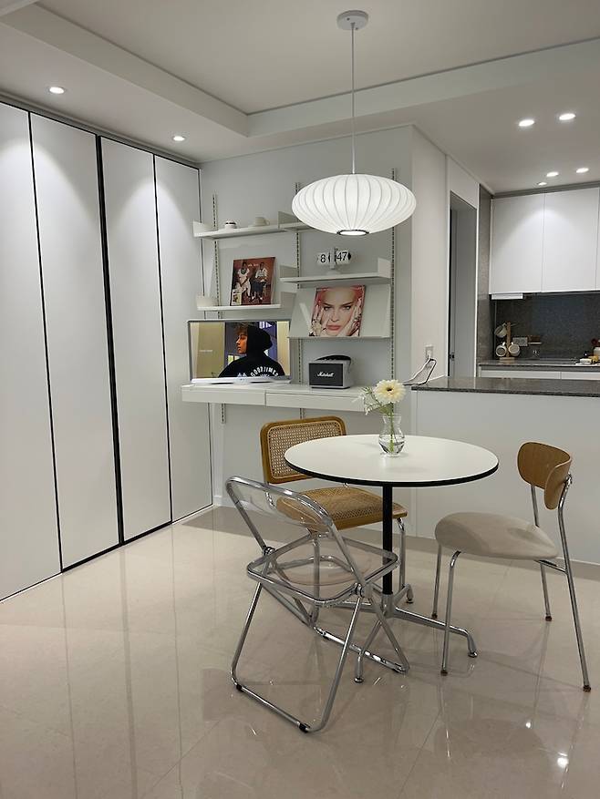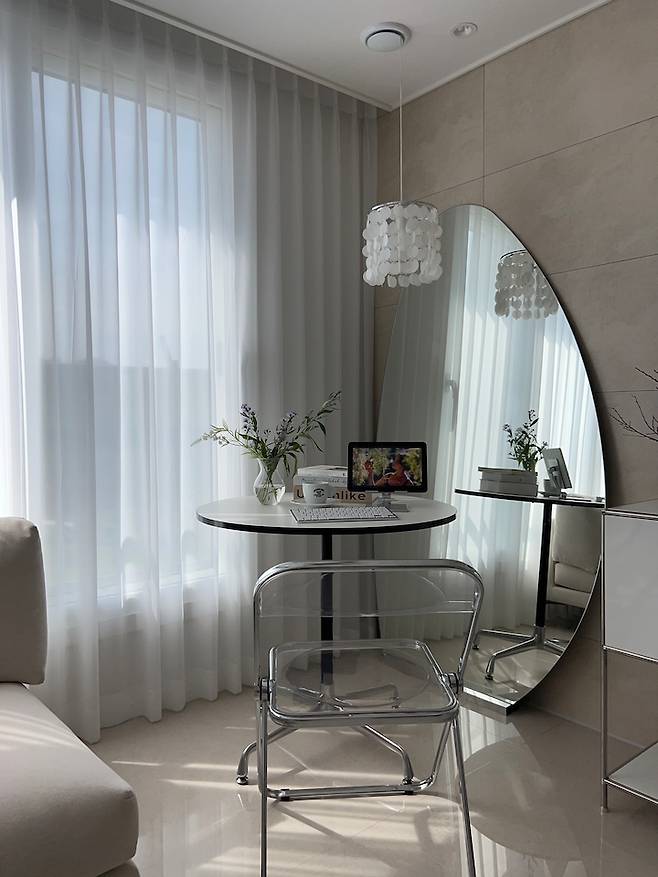 그리고 그 옆에는 대형 전신거울을 두어 집이 확장되는 느낌과 함께 외출 전 여기서 그날 의상을 체크하기도 해요.