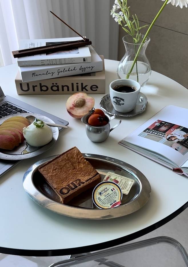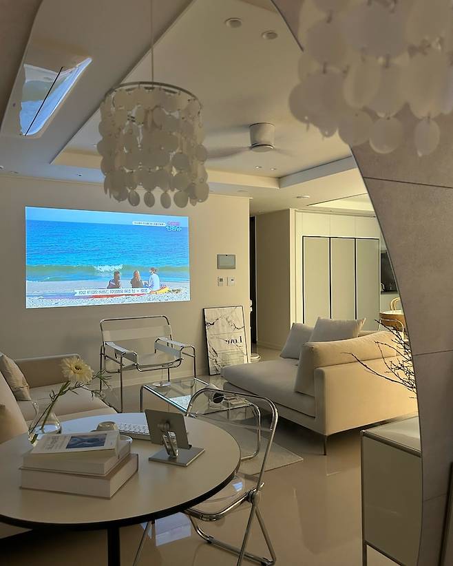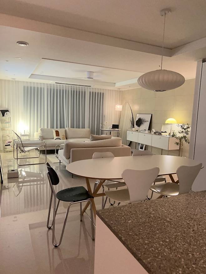 원래는 일렬로 붙여서 생활했었는데 (초반 남편의 로망 실현을 위함^^) 저는 일반 가정집 무드가 아닌 카페 같은 집 무드를 원했기 때문에 남편에게는 미안하지만 카우치와 본체를 대면형으로 두어 저의 로망을 완성시켰어요^^ 그리고 거실에 티비도 과감히 없애고 주로 빔이나 룸앤티비를 이용하고 있어요.