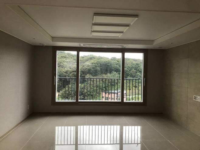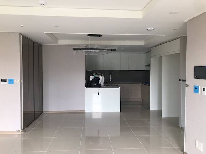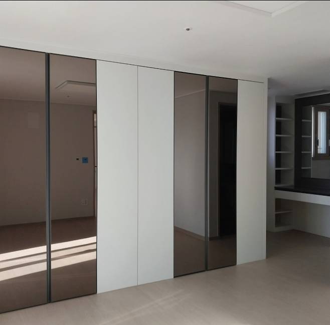 사전 점검 갔던 날 날씨까지 흐려서 그때는 이 집의 뷰도 눈에 안 들어왔고, 계속 "좁다 좁아...."이 말만 되풀이 했던 거 같아요. 거실도 주방과 마찬가지로 회색 벽지와 우드색 샷시(새시) 아이보리 대리석 바닥과 브라운이 감도는 아트월까지 색상의 통일감이 전혀 없었어요.