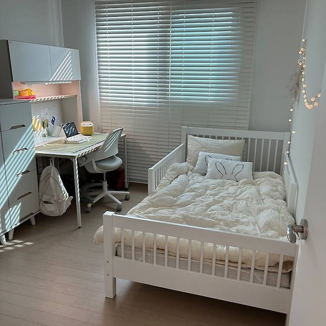 가구를 고를 땐 이번에 첫 분리수면에 도전하는 거여서 침대에서 떨어질 우려가 있기 때문에 침대가드가 있는 것으로 골라 아이의 안전을 지켜주었고, 책상은 딸 아이 절친과 커플 책상을 사고 싶다고 해서 딸아이가 고른 데스커 책상이에요.