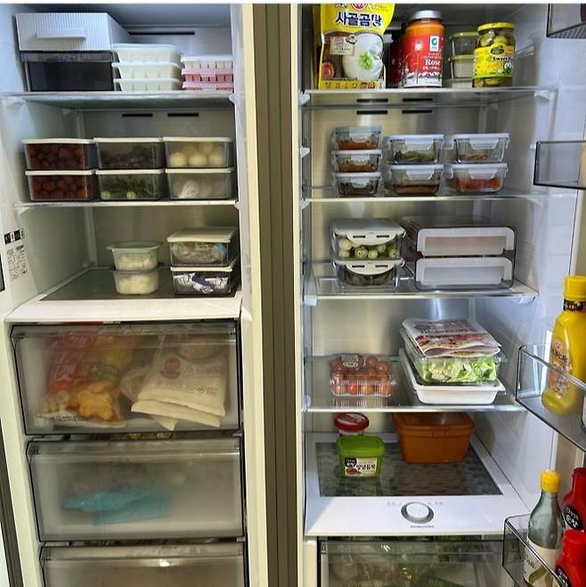 모든 요리 시작 전 열게 되는 냉장고도 항상 깔끔하게 정리하려고 노력하고 있어요. 반찬통을 통일하면 냉장고가 깔끔해보이는 것 같아요.