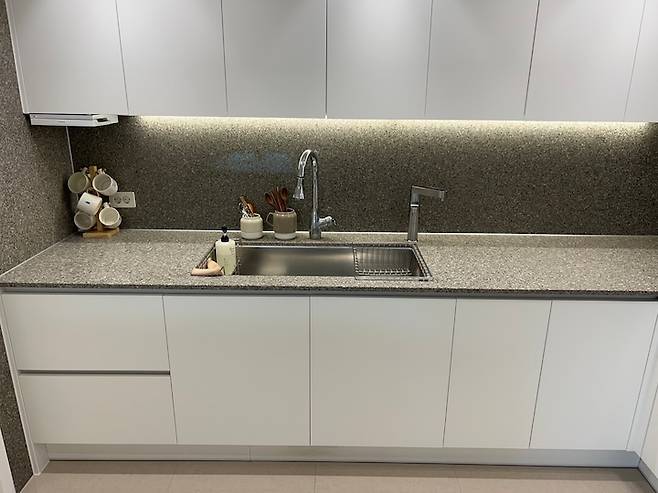 그리고 다음 보여드릴 곳은 저희 싱크대에요. 저는 항상 이사 온 첫 날처럼 깨끗하게 살자가 목표이기 때문에 최대한 깔끔한 주방을 유지하려고 노력해요. 싱크대에 물건이 많이 있으면 더 좁아보이기 때문에 싱크대 위에는 컵과 수저통만 올려놓았어요.