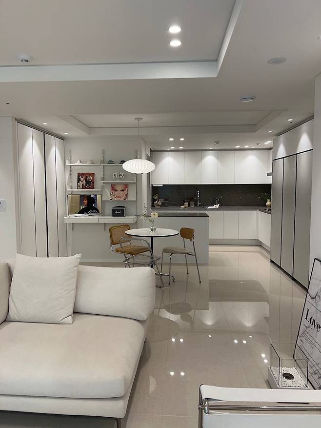 그래서 거실도 화이트로 톤을 일치시켰어요. 그랬더니 어두워 보이던 대리석 바닥이 훨씬 고급스러워 보이더라구요^^ 그럼 거실 after 보여드릴게요~~