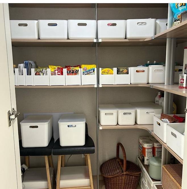 저는 모든 딱딱 각 맞춰 정리하는 것을 좋아해요. 그래서 주방 옆 팬트리에는 작은 정리함들을 놓아 물건들이 너저분하게 돌아다니지 않게 하고 있어요.