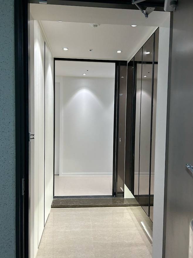 집의 첫 이미지를 결정짓는 곳이 현관이다 보니 현관은 조금 밝았음 좋겠다 생각해서 이 곳도 간접등과 기존 천장등 제거 후 매립등 설치해주었어요. 중문도 옵션으로 들어가 있었어요.
