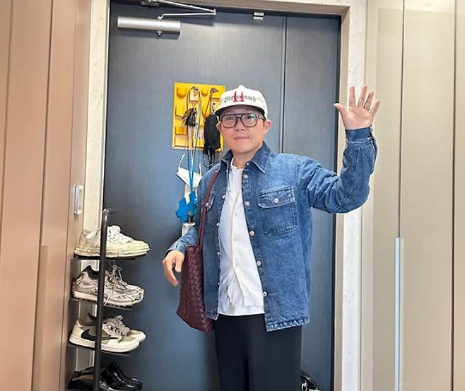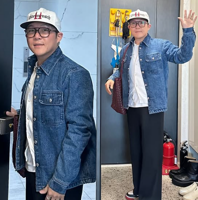 조세호 님은 데님 청자켓에 흰 티셔츠, 블랙 와이드 팬츠에 검정색 스니커즈를 착용했어요. 모자는 레터링이 더해진 볼캡으로 포인트를 주었는데요. 가방은 와인 컬러의 빅백을 착용했죠.