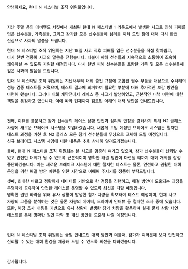 - 18일 용인 스피드웨이에서 펼쳐진 현대 N페스티벌 N2 클래스에서 브레이크 이상으로 연쇄 사고…참가선수 대거 보이콧 선언