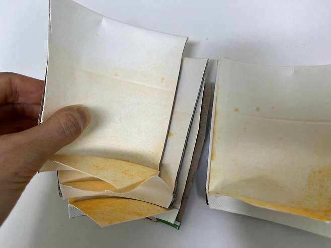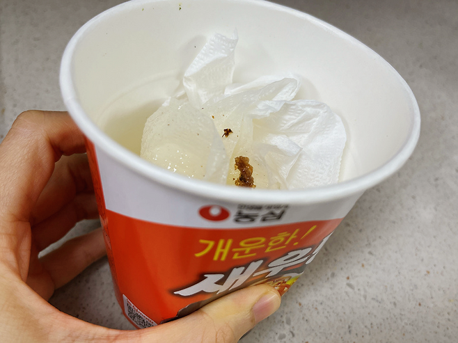그럴 때 다 먹은 컵라면 용기를 버리지 말고 모아 뒀다가 기름 닦아낸 키친타월을 담는 용기로 활용해 보세요. 혹은 기름 자체를 컵라면 용기에 부은 후 굳혀서 버려도 됩니다.