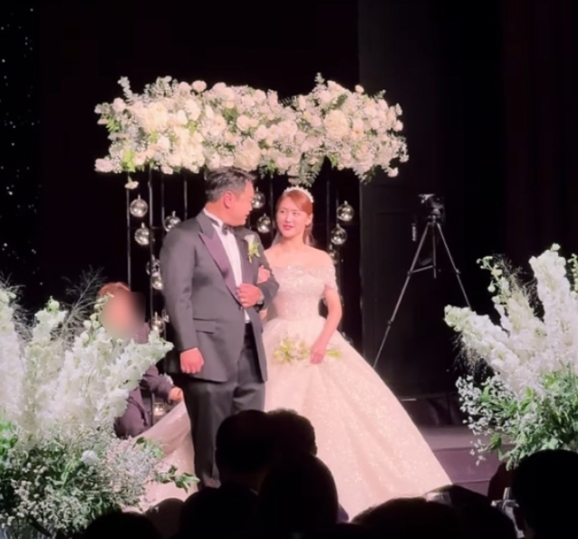 결혼식에서 에이민은 비즈가 수놓인 오프숄더 드레스를 입고 화이트 컬러 부케로 청순한 분위기를 자아냈다.