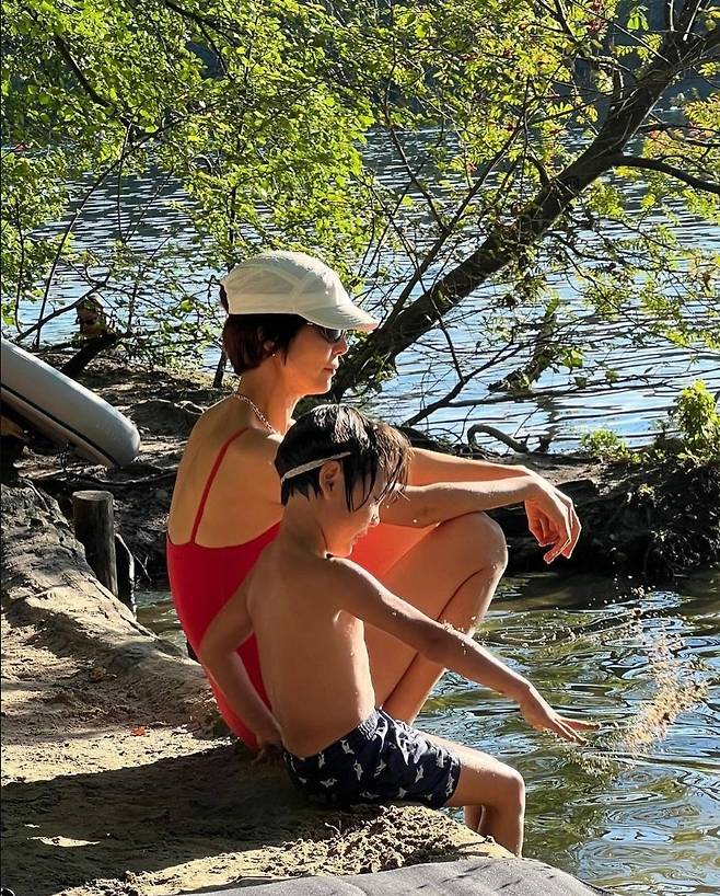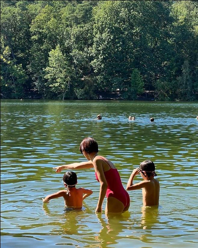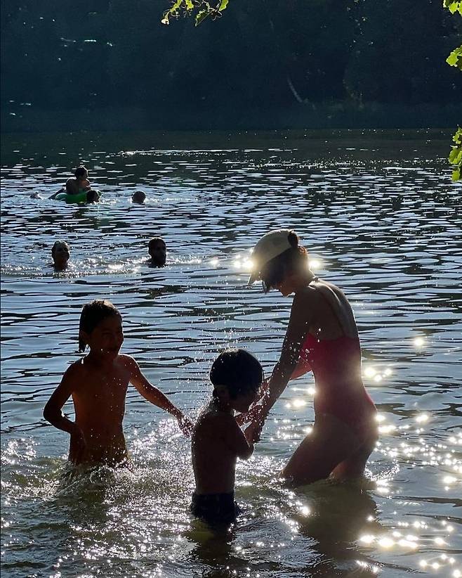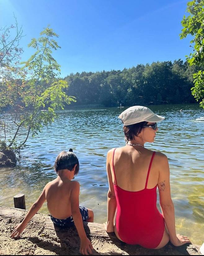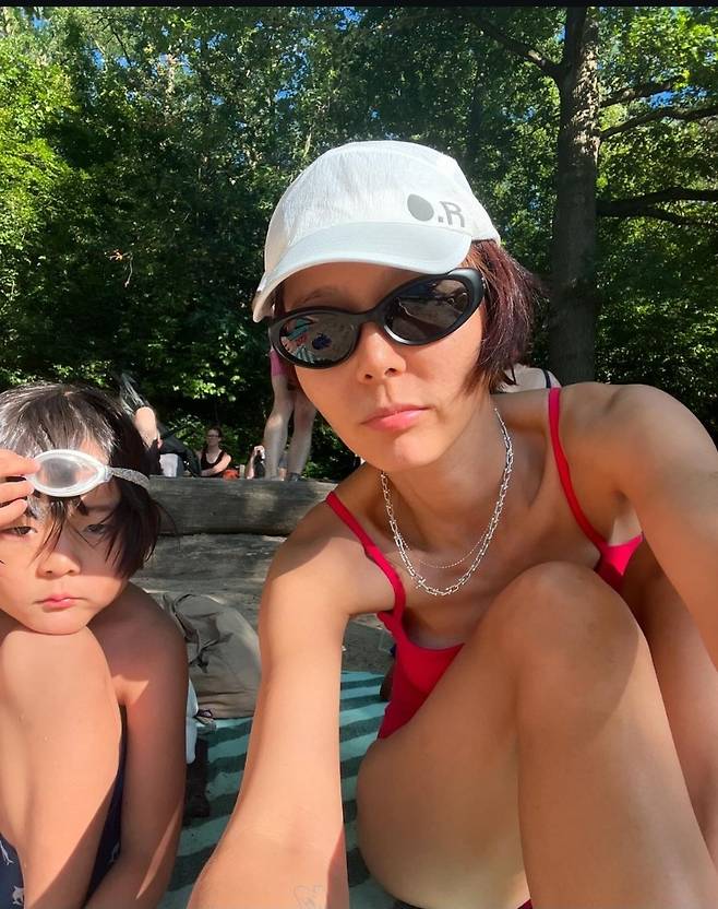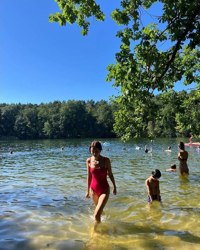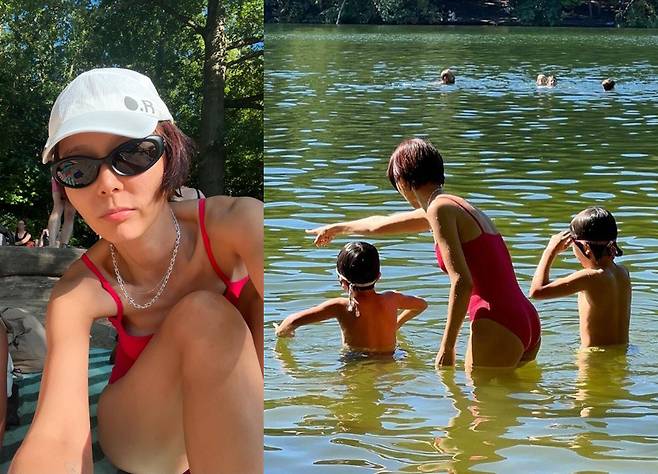 김나영은 레드 수영복을 착용해 강렬하고 시원한 패션을 선보였습니다.