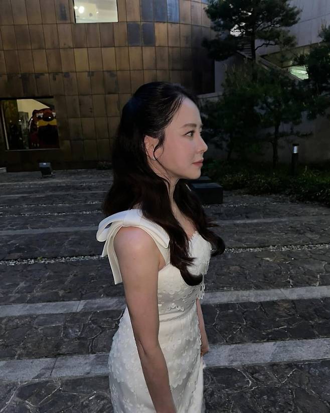 송지효는 어깨를 감싸는 리본 스트랩과 입체 자수가 돋보이는 롱드레스를 착용하고, 단정한 웨이브 헤어로 청순미를 극대화했습니다.