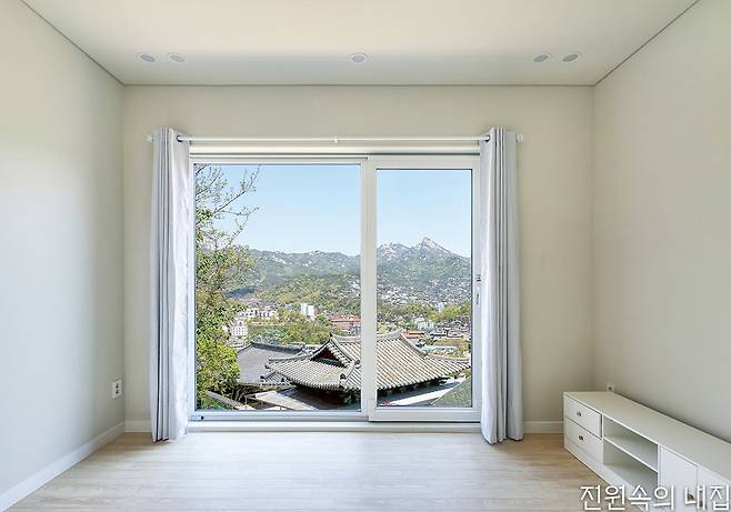 집은 어머니와 건축주가 지낼 방 2개와 다락방으로 구성되었는데, 규제 안에서 면적을 최대한 실용적으로 활용하고자 했다. 우선 북한산과 북악산의 빼어난 전망을 가득 담을 수 있게끔 실을 한쪽으로 몰고 거실과 주방을 통합해 넓은 공간을 조성했다. 또한 2.8m의 높은 층고로 아담한 규모가 답답하지 않게 느껴진다.