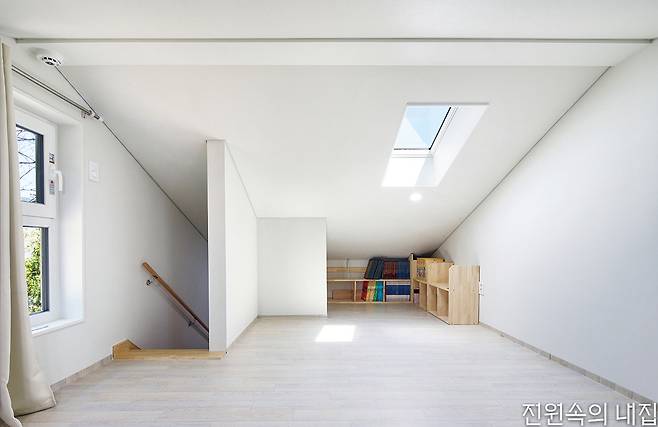 거실 앞으로 만들어진 데크에 걸터앉으면 시원한 절경을 한눈에 감상할 수 있다. 다락은 건축주의 손주들이 찾아왔을 때 편하게 놀 수 있도록 지붕선을 60cm가량 높여 개방감 있는 공간을 완성했다.