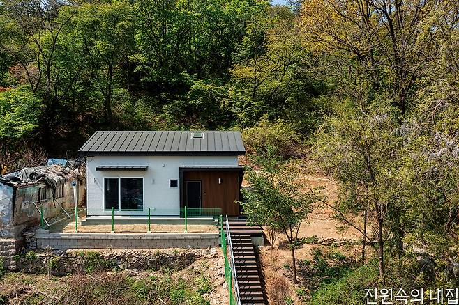 부지까지 차량이나 장비가 올라올 수 없는 상황이기 때문에 목조주택을 계획했고, 건축박람회에서 로드하우징을 만나 작업을 진행했다. 공사 과정은 예상대로 쉽지 않았다. 모든 자재는 200m 정도 떨어진 주차장에서부터 일일이 작업자의 손으로 옮겨졌다.