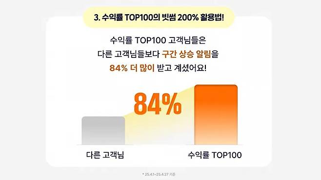 무엇보다 '구간 상승 자동 알림' 기능은 무려 84%의 이용률을 기록했고, 신고가 및 신저가 알림은 2.2배 더 많이 사용됐다. 이는 정보 기반의 선제적 대응이 수익률을 높이는 데 기여했음을 보여준다.