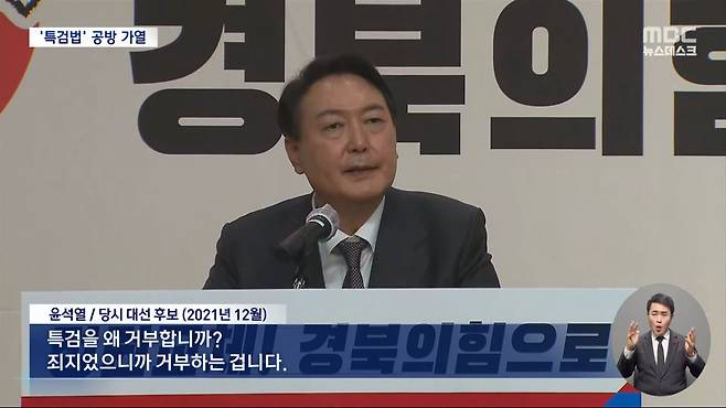 - 문재인 정부 검찰에서 이미 조사한 사건이고 기소조차 못하지 않았느냐는 게 윤석열(대통령)의 주장이다. 박용현(한겨레 논설위원)은 다르게 평가한다. “윤석열 정부 검찰도 무혐의 처분을 못하고 쥐고 있는 사건”이다. 그래서 “특검 필요성이 더 커졌다”는 이야기다.