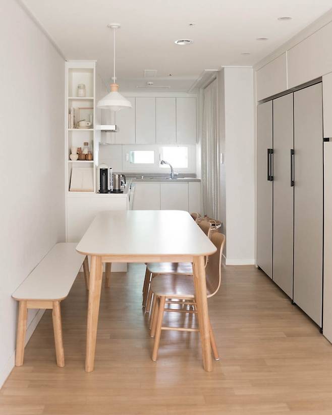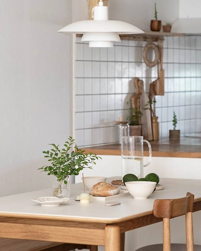 화이트 오크는 하드우드에 속해서 주방가구에 사용하기 적합하고 특유의 톤 다운된 색감이 매력적이에요. 식기는 우드와 잘 어울리는 베이지 컬러의 도자기를 선택했습니다.