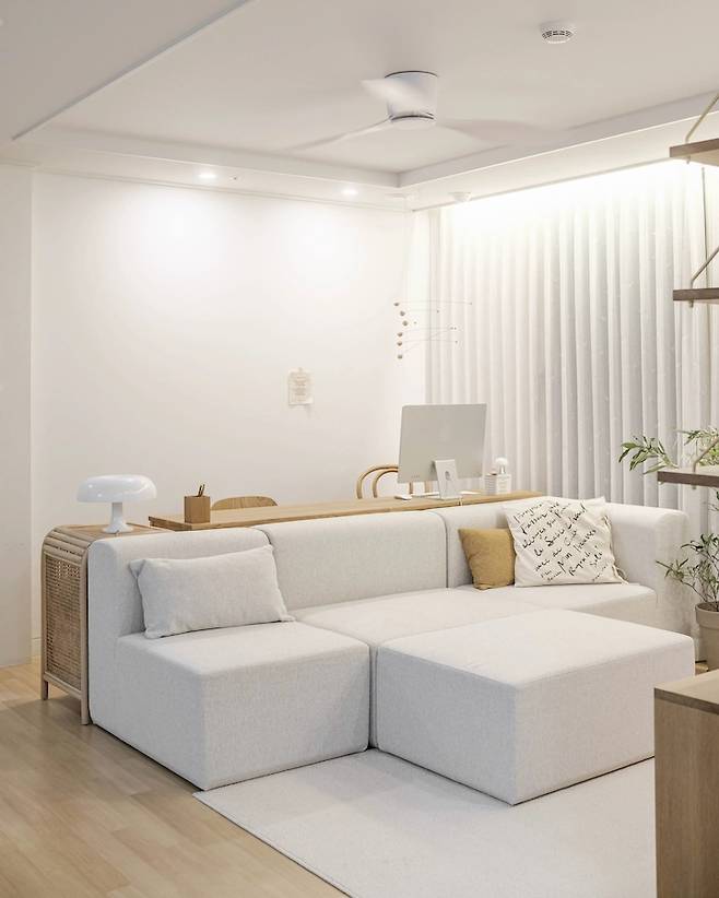 맞은편에 소파를 두었어요. 책상에 앉은 사람과 소파에 앉은 사람이 마주 보고 각자의 활동을 하며 시간을 보내기 좋은 구조였어요.