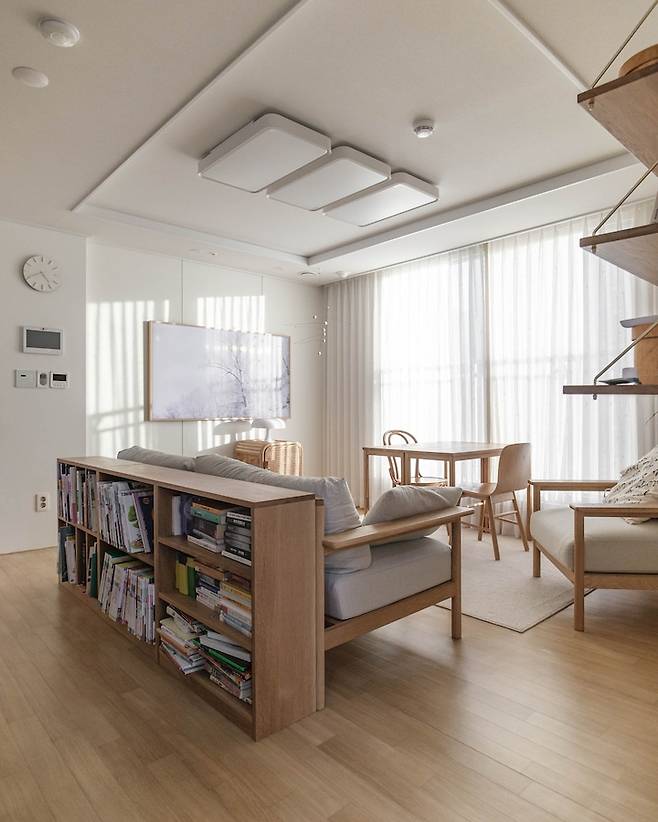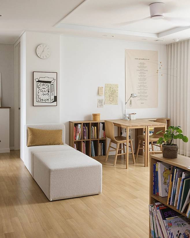 거실 가구를 구입할 때 신경 쓴 부분은 높이와 부피감이었어요. 낮은 소파를 선택해 공간이 답답해 보이지 않게 했고, 부피감이 나눠지는 모듈형 가구를 선택해 다양한 공간의 변화를 만드는 재미 요소를 더했습니다. 온 가족이 모여 다양한 활동을 하고 함께 편안함을 누릴 수 있어서 만족해요.
