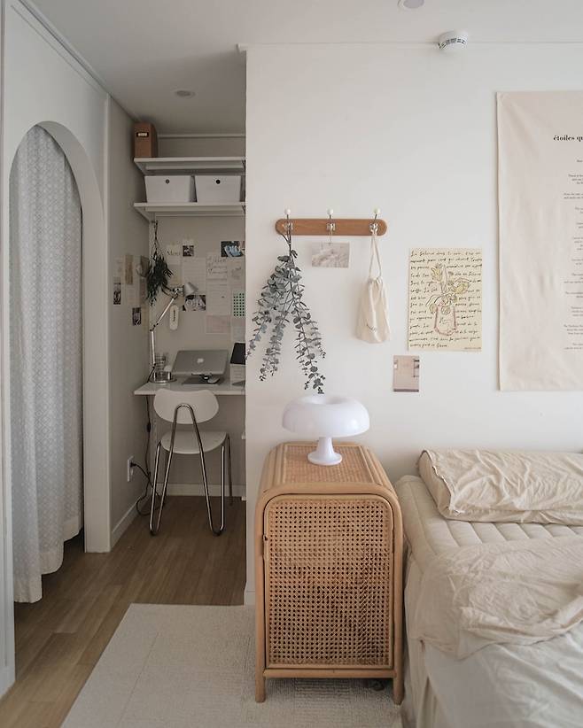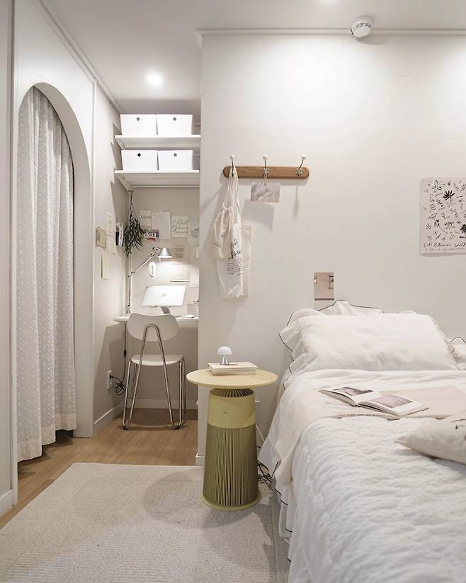 한 쪽에는 침실 공간, 한 쪽은 책상 공간으로 나누어 분리했어요.