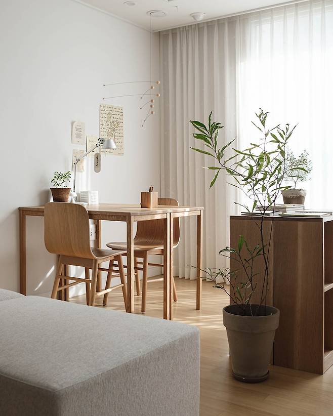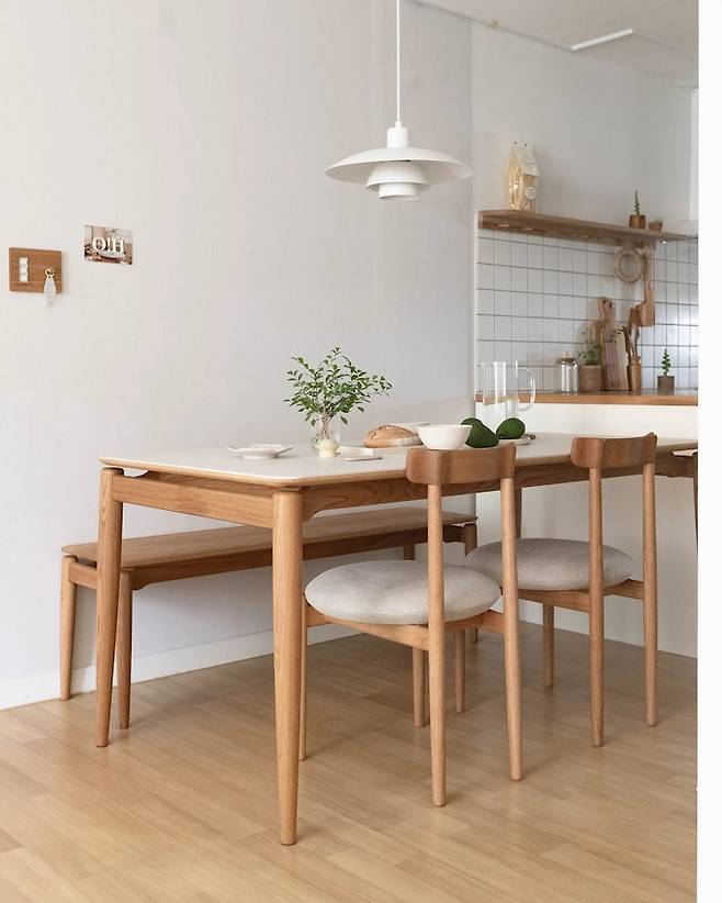 수종마다 색감과 결이 달라요. 서로 조화롭게 잘 맞았으면 하는 바람에서 식탁을 들일 때 수종을 '화이트 오크'로 알아보았어요.