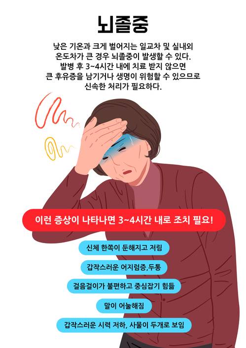뇌졸중은 뇌혈관이 막히거나 파열돼 뇌에 급성 뇌 손상이 발생하는 질환으로, 주요 사망 원인 중 하나로 지목된다. 고령 인구 증가에 따라 발생률은 계속 증가하고 있으며, 2021년 기준으로 국내 뇌졸중 발생률은 인구 10만 명당 212.2건, 80세 이상 고령층에서는 1500건 이상 발생한다. 주요 증상으로는 한쪽 팔·다리의 마비, 언어 장애, 얼굴 비뚤어짐, 의식 저하 등이 있다. 뇌졸중이 의심되면 즉시 119에 신고하고 빠른 치료가 필요하다. 뇌졸중의 위험인자에는 고혈압, 당뇨병, 고지혈증, 심장병(심장 질환), 뇌졸중 가족력 등이 있으며, 이들 위험인자를 관리하는 것이 예방에 중요하다.