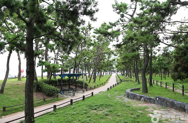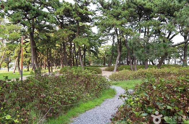 송림공원은 약 44,000㎡ 규모로, 해수욕장과 자연녹지, 동백유원지까지 이어지는 복합 힐링 공간입니다. 특히 울창한 소나무 아래 시원한 그늘이 펼쳐져 있어, 여름에도 부담 없이 산책을 즐길 수 있는 곳이죠.