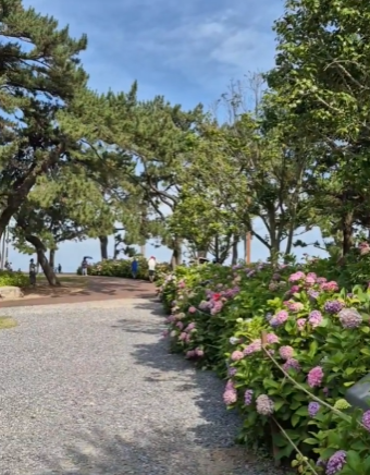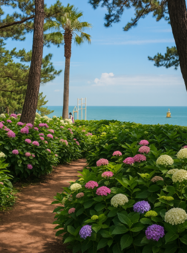 매년 6월 말부터 7월 초까지, 송림공원은 부산 대표 수국 명소로 변신합니다. 보랏빛, 연분홍, 하늘색… 다채로운 수국이 소나무숲 아래서 군락을 이루며 만개합니다. 바다를 배경으로 펼쳐진 수국은 그야말로 그림 같은 장면을 연출합니다.