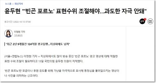 그러나 불과 한 달 전 국회 과학기술정보방송통신위원회 소속 윤두현 국민의힘 의원은 지상파 광고 영상 문제를 지적하며 ‘빈곤 포르노’ 문제를 지적했습니다. 연합뉴스 [윤두현 “‘빈곤 포르노’ 표현수위 조절해야…과도한 자극 안돼”] (10월 13일 이정현 기자)에서 윤두현 의원은 “지원이 필요한 국내외 취약계층에 대한 후원과 모금 광고의 필요성에 매우 공감하며, 후원자와 구호단체의 활동에 대해 높이 평가한다”면서도 “지나치게 자극적인 영상은 다른 문제”라고 짚으며 “과도하게 자극적인 영상으로 영상 속 등장인물들에 피해를 주면 안”되고 “인권을 고려해 표현의 적절한 수위 조절이 필요하다”고 지적했습니다. 국민의힘 의원 역시 ‘빈곤 포르노’의 문제를 경계하고 인권을 존중해야 한다고 강조한 것입니다.