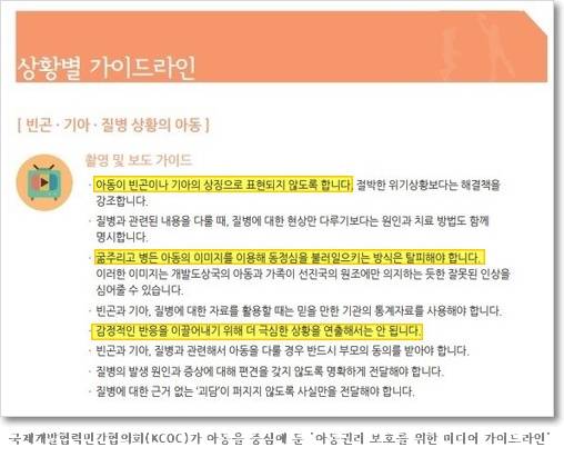 우리나라에서도 2014년 국제구호개발 NGO와 국제개발협력민간협의회(KCOC)가 아동을 중심에 둔 ‘아동권리 보호를 위한 미디어 가이드라인’을 마련했습니다. 가이드라인은 “굶주리고 병든 아동의 이미지를 이용해 동정심을 불러일으키는 방식은 탈피해야” 하며 “감정적인 반응을 이끌어내기 위해 더 극심한 상황을 연출해서는 안 된다”고 제시했습니다.
