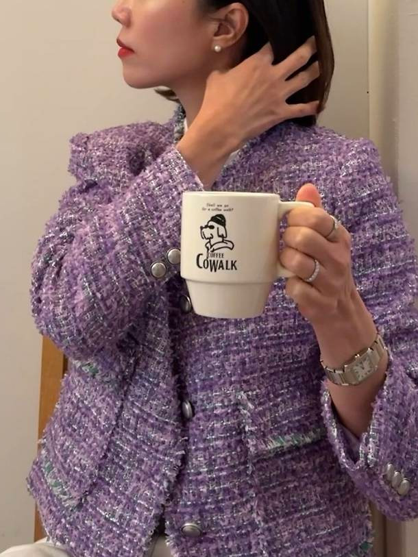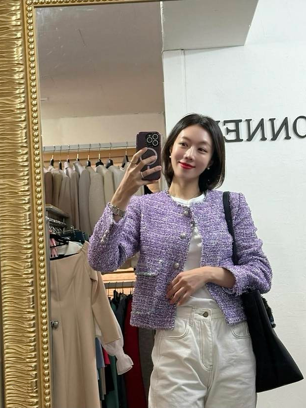 아나운서 출신 방송인 서현진이 화사한 라일락 컬러 트위드 재킷으로 봄 분위기를 완벽하게 담아냈습니다.