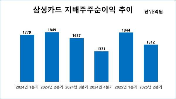 반면 수익성은 악화했다. 2분기만 놓고 보면 영업이익은 2005억원, 지배주주순이익은 1512억원으로 1년 전보다 각각 19.4%, 18.2% 하락했다. 앞서 증권사들은 삼성카드가 해당 분기 1700억원의 지배주주순이익을 거둘 것으로 예상했지만 기대치(컨센서스)를 밑돌았다.