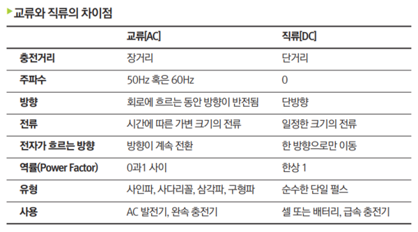 현재 대부분의 국가들은 발전소에서 나오는 직류 전기를 국가 전력망을 통해 장거리 전송에 유리한 AC 전류로 변환하게 되는데, 이를 이유로 대부분의 전자제품은 교류 전기에 맞춰 설계된다. 하지만 전기차의 배터리는 대부분 400V 이상의 고전압 직류 배터리로 설계되기 때문에 배터리를 충전하려면 교류로 변환돼 공급된 전기를 다시 직류로 바꿔줘야 한다. 충전기의 생김새가 간단해 보이는데 가격이 비싼 이유가 충전 시 이러한 복잡한 과정을 거치기 때문이다. 이에 따라 전기차 충전기도 크게 AC(교류) 충전과 DC(직류) 충전으로 나눌 수 있다. 여기서 교류 충전은 완속 충전을, 직류 충전은 급속 충전을 의미한다.