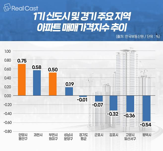 하지만, 최근 들어서는 평촌과 중동 지역의 일부 단지에서도 집값 상승이 눈에 띄게 활발해지고 있습니다. 리얼캐스트가 한국부동산원 자료를 조사한 바에 따르면, 지난해 11월 1주~12월 5주간 평촌신도시가 자리한 경기 안양시 동안구의 주간아파트 매매가격지수는 0.75% 상승하며 같은 기간 성남시 분당구의 0.19%를 넘어섰습니다.