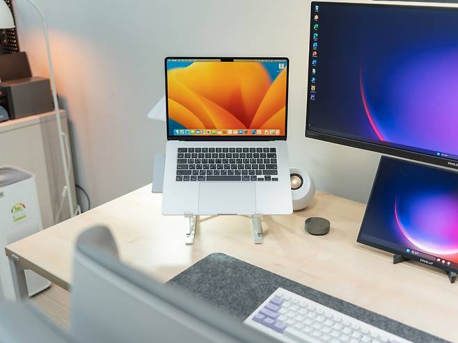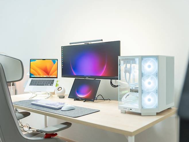 1800x800mm의 넓은 데스크 상판은 모든 작업 스타일에 적합한 공간을 제공합니다. 저는 34인치 울트라 와이드 모니터, 16인치 서브 모니터, 노트북, 데스크톱 본체를 배치했지만, 공간이 여유로웠습니다.