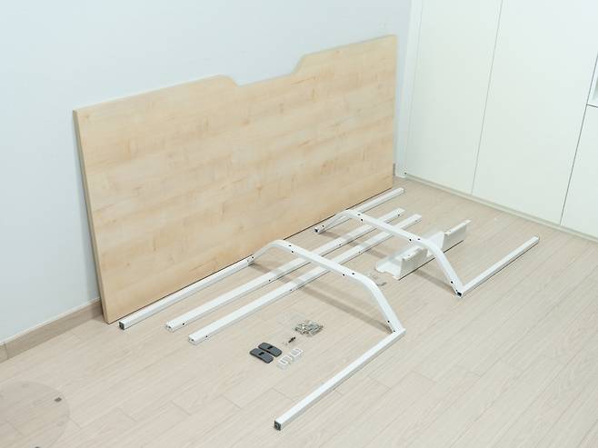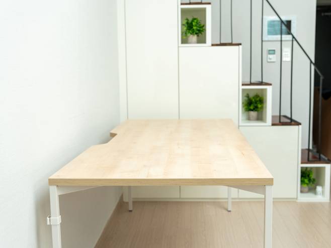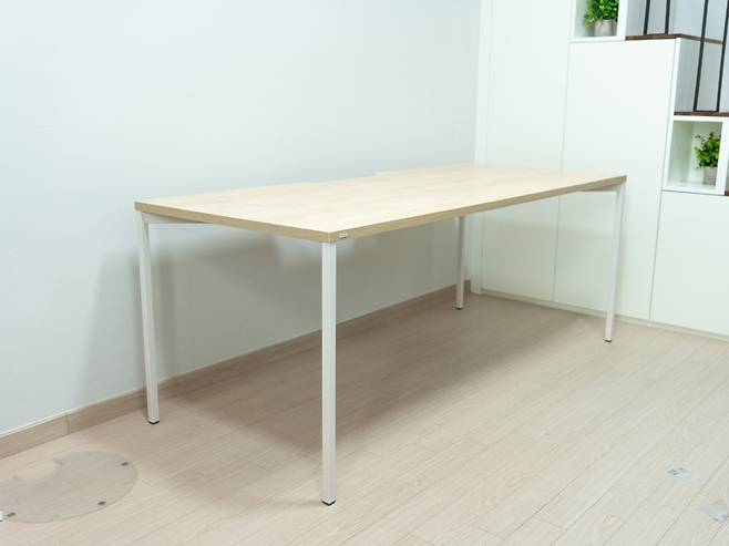 제가 선택한 컬러는 메이플+화이트 조합으로 화이트 스탠드에 메이플 상판으로 구성되어 있어 산뜻하고 따뜻한 느낌을 줍니다. 특히 자연스러운 나뭇결 및 옹이 무늬로 실제 원목상판과 같은 느낌을 구현하고 있습니다.