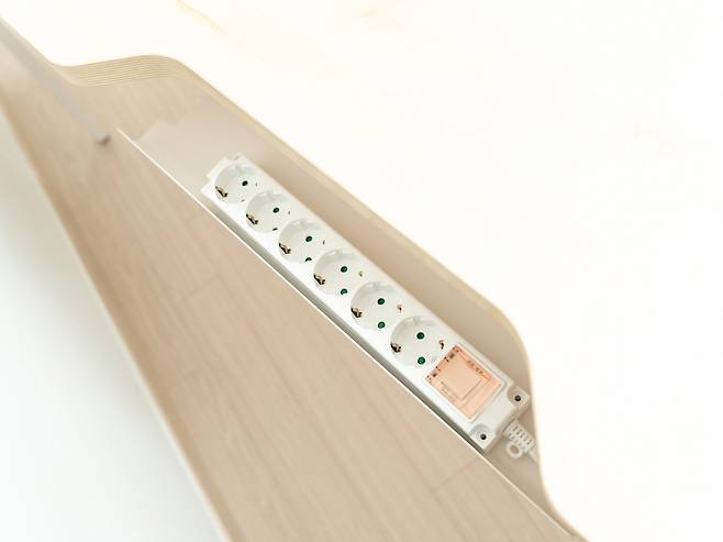 넉넉한 공간의 배선트레이에는 다양한 규격의 멀티탭을 거치할 수 있는데요 트레이는 가로 520mm 폭 122mm 높이 108mm이며 가운데 홀이 있어 케이블라우팅이 용이합니다.